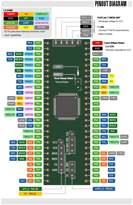 ●49本すべてのI/O信号を引き出し、UART・SPI・I2C・デバッグ用の通信専用ピンを別途設けています。